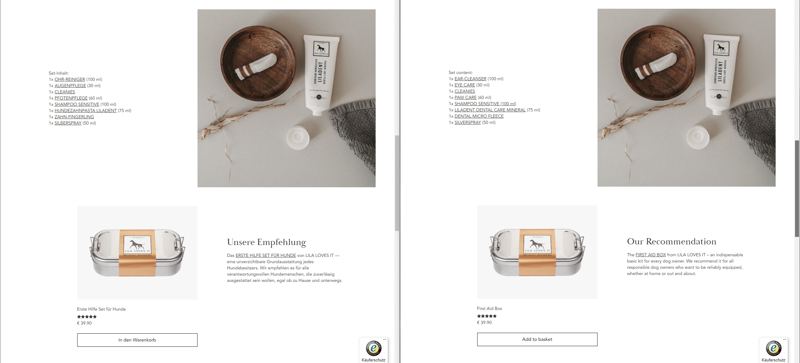 Headers can be descriptive. Baskerville headers should never be CAPsed. Inline texts need to mention the exact product name in CAPS format. The brand name should either not be included or visually spaced. This can be achieved by following with “from” or “by” or lead with “favoroite” or “popular” (i.E. “FIRST AID BOX by LILA LOVES IT”).